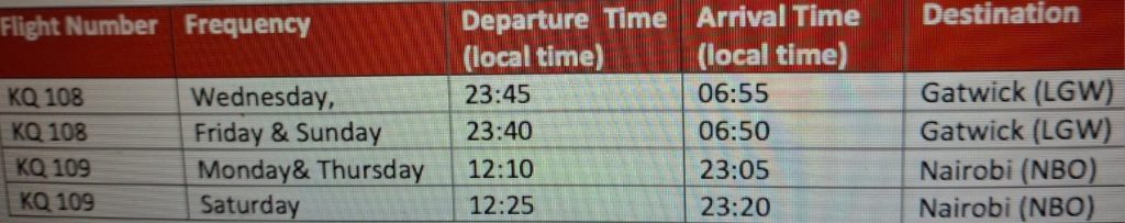The flights to Gatwick will operate at night out of Nairobi, three times a week on Wednesday, Friday and Sunday and will complement the existing London schedule increasing the London frequency to 10 weekly flights.