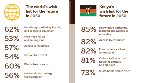 In the next three decades, Kenyans would most like to experience free trade (82%), self-powering and energy producing transportation (72%), carbon free travel (68%), e-commerce (66%), and cloud computing, big data and Artificial Intelligence (AI) (66%). From a sustainability point of view, they would most like to experience smart cities (73%), sustainable architecture and infrastructure (71%), and sustainable food (70%).