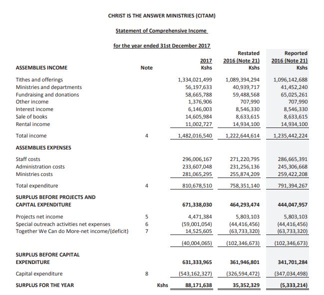 The Nairobi Chapel – All The Assemblies – statement of comprehensive income indicates it collected Ksh632.3 million as at 31 December 2017 compared to Ksh434.6 million the previous year. Tithes and offerings accounted for Ksh355.7 million in 2017 up from Ksh272.2 million in 2016.
