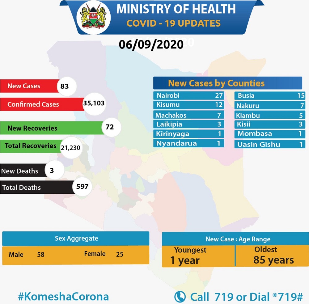 Meanwhile, the Ministry of Health said of the new infections 77 are Kenyans and six foreigners aged between one and 85 years. The cumulative COVID-19 tests since the pandemic hit the country in March stands at 474,477.