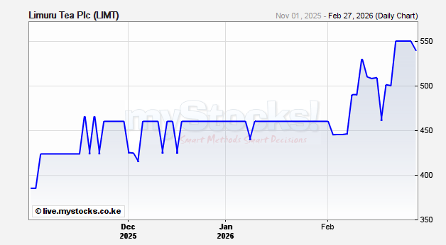 Limuru Tea share price is currently trading at KSh 550 with a 52 week range of KSh 295 to KSh 555. The firm’s market capitalization is currently at KSh 1.32 billion.