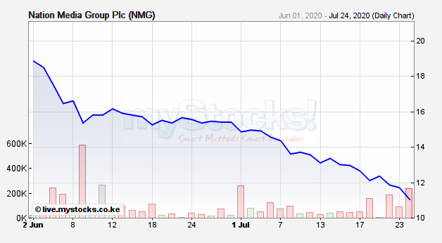 Nation Media Group opened the year 2020 at Ksh39.75 signifying a share price depreciation of nearly 70% to date. On 13th March when the first COVID-19 case was reported in Kenya, NMG shares were trading at an average of Ksh28.15.