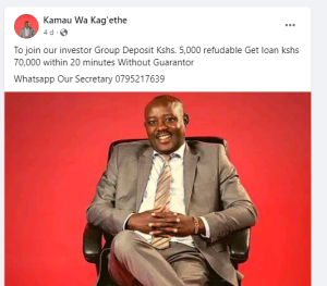 “To join our investor Group Deposit Kshs. 5,000 refudable Get loan kshs 70,000 within 20 minutes Without Guarantor. Whatsapp Our Secretary 0795217639 (sic),” the post read.