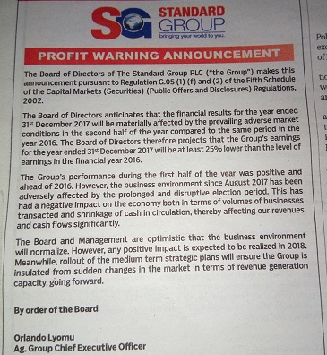 “The Board of Directors anticipates that the financial results for the year ended 31st December 2017 will be materially affected by the prevailing adverse market conditions in the second half of the year compared to the same period in the year 2016. The Board of Directors therefore projects that the Group’s earnings for the year ended 31st December 2017 will be at least 25% lower than the level of earnings in the financial year 2016,” the notice signed by acting CEO Orlando Lyomu read in part.
