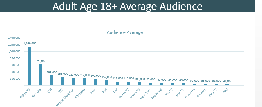 Further according to the report, Citizen TV was still the most viewed channel by adults aged 18 or above watching TV with their children aged 14 or below averaging 1.15 million viewers followed by Akili Kids (628,000), KTN Home (296,000), NTV (256,000) and Maisha Magic East (221,000).